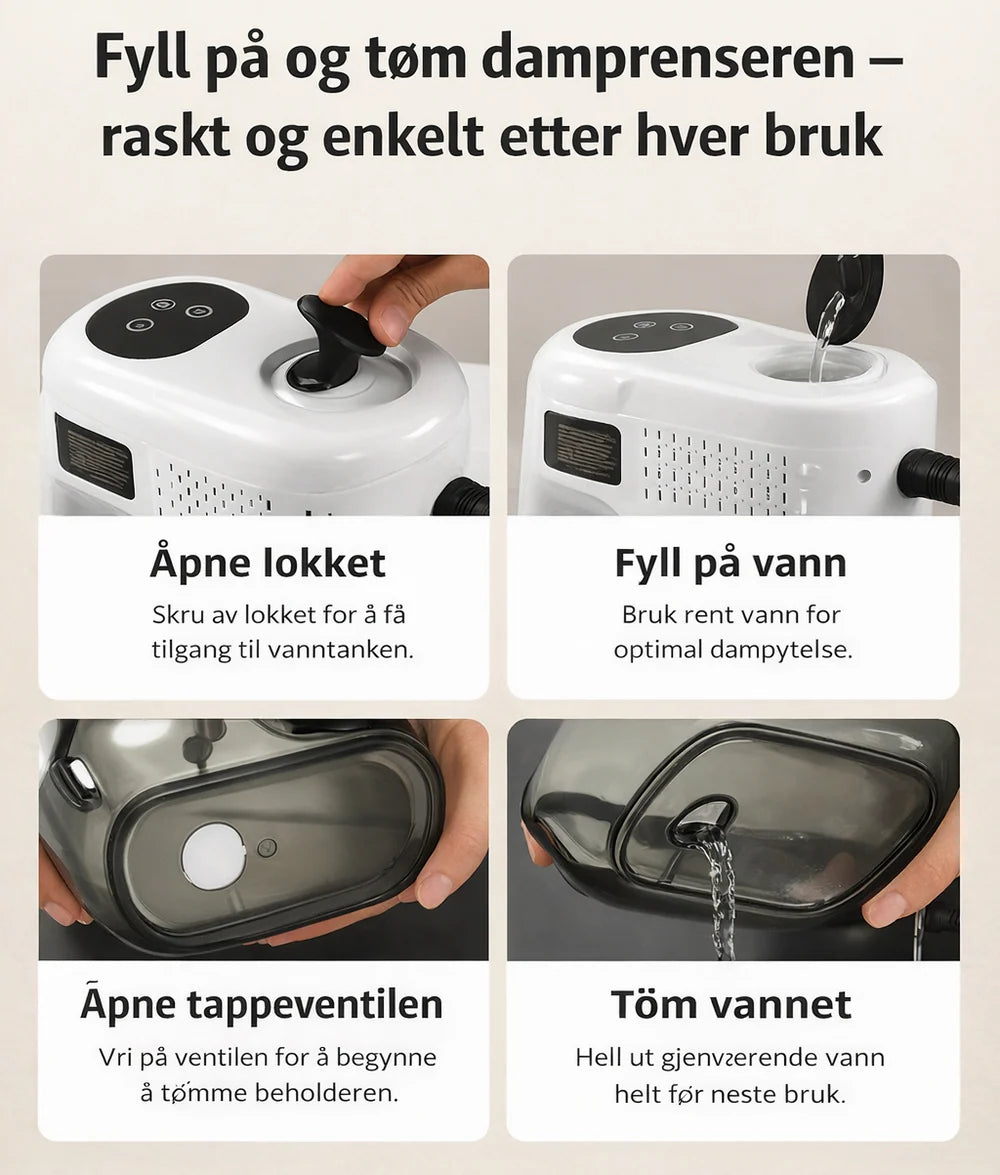 KvikkSteam™ uses only water — no harsh chemicals. Keep the nozzle at a safe distance and avoid prolonged steam on sensitive materials. Let surfaces cool before touching.
